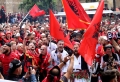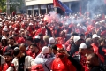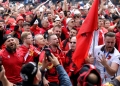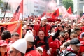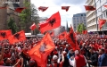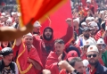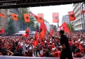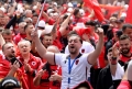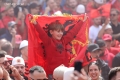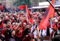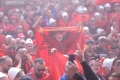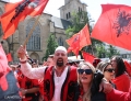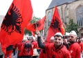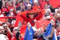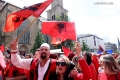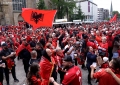 Fans of the Albanian national football team singing with flags in their hand in the streets of Dortmund before the football match between the Albanian national football team and the Italian national football team at the Westfalenstadion stadium, as part of the group stage for EURO 2024 in Germany. This is the second time that the Albanian national team takes part in a European championship.