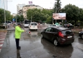 A policeman directing traffic on a street near the center of Tirana. Most of Albania is affected by bad and unstable weather and rainfall.