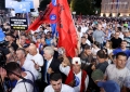 Citizens with flags and signs during a protest in front of the prime minister's office called by the opposition. The protest was announced a few weeks ago, when the Court of Appeal gave the DP stamp to former Prime Minister Sali Berisha. The goal of the opposition for this protest is the creation of a technical government.