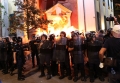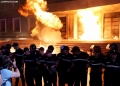 Police forces stand in front of Tirana municipality, while a molotov bar explodes behind them, during a protest called by the opposition. The protest was announced a few weeks ago, when the Court of Appeal gave the DP stamp to former Prime Minister Sali Berisha. The goal of the opposition for this protest is the creation of a technical government.
