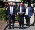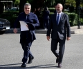 Ministri i Turizmit, Kultures dhe Sportit, Blendi Gonxhe dhe Deputeti Ulsi Manja jashte ambienteve te parlamentit para nje seance.