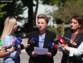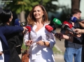 Deputetja Erisa Xhixho duke folur per gazetaret jashte ambienteve te parlamentit para nje seance.