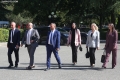 Deputetet Oerd Bylykbashi, Albana Vokshi dhe Gent Strazimiri jashte ambienteve te parlamentit para nje seance.
