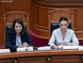 Ministrja e puneve te brendshme, Albana Kociu dhe Zv/kryeministrja dhe ministrja per infrastrukturen dhe energjine, Belinda Balluku gjate nje seance parlamentare. Gjate seances, ka pasur debate mbi ministren AI Diella.