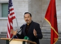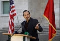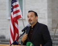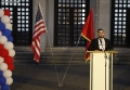 Altin Goxhaj gjate nje ceremonie homazh ne nderim te aktivistit amerikan, Charlie Kirk, para universitetit te Arteve ne Tirane. Kirk nderroi jete pas nje atentati ne Utah.