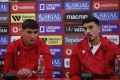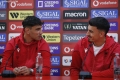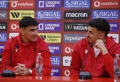 Lojtaret e kombetares shqiptare te futbollit, Qazim Laci dhe Julian Shehu gjate nje konference per shtyp para ndeshjes me kombetaren e Serbise, ne kuader te kualifikuesve per boterorin 2026.