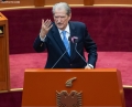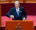 Kryetari i partise demokratike, Sali Berisha duke folur gjate nje seance parlamentare. Gjate seances ka pasur debate mbi perfshirjen e emrit te Enver Hoxhes ne nje material te parlamentit, mbi personat e lindur ne tetor.