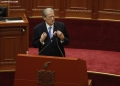Kryetari i partise demokratike, Sali Berisha duke folur gjate nje seance parlamentare. Gjate seances, u miratuan tre projektrezoluta, nje projektligj dhe dy projektvendime