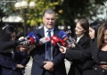 Deputeti Tedi Blushi duke folur per gazetaret para se te hyje ne ambientet e parlamentit per nje seance. Seanca eshte mbajtur pasi eshte betuar deputetja e re Briseida Cakerri dhe eshte rrezuar kerkesa per te shkarkuar kryetarin e parlamentit, Niko Peleshi.