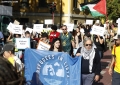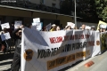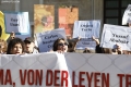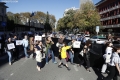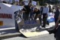 Protestues me banderola dhe pankarta gjate nje proteste ne Tirane. Ne protesten qe kane marre te rinj shqiptare dhe te huaj jane shprehur kunder kampit ne Gjader dhe trajtimit te refugjateve.