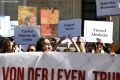 Protestues te shoqerise civile mbajne nje karton me imazhet e Ursula Von Der Leyen, Donald Trump, Edi Rama dhe Georgia Meloni gjate nje proteste ne Tirane. Ne protesten qe kane marre te rinj shqiptare dhe te huaj jane shprehur kunder kampit ne Gjader dhe trajtimit te refugjateve.