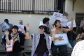 Protestues me banderola dhe pankarta gjate nje proteste para kryeministrise ne Tirane. Ne protesten qe kane marre te rinj shqiptare dhe te huaj jane shprehur kunder kampit ne Gjader dhe trajtimit te refugjateve.