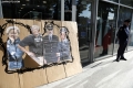 PROTESTE PARA KRYEMINISTRISE PER REFUGJATET - Protestues te shoqerise civile mbajne nje karton me imazhet e Ursula Von Der Leyen, Donald Trump, Edi Rama dhe Georgia Meloni gjate nje proteste para kryeministrise ne Tirane. Ne protesten qe kane marre te rinj shqiptare dhe te huaj jane shprehur kunder kampit ne Gjader dhe trajtimit te refugjateve.