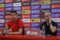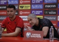 Trajneri i kombetares shqiptare te futbollit, Sylvinho dhe lojtari Berat Gjimshiti gjate nje konference per shtyp para ndeshjes me kombetaren e Anglise, ne kuader te kualifikuesve per boterorin 2026.
