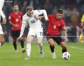 Ivan Balliu i Shqiperise dhe Eberechi Eze i Anglise gjate ndeshjes se futbollit, Shqiperi-Angli, 0-2, e vlefshme per fazen e grupeve te kualifikueseve per Boterorin 2026 e luajtur ne stadiumin Arena Kombetare ne Tirane. Shqiperia eshte kualifikuar matematikisht ne fazen playoff te kualifikueseve per Boterorin 2026, ndersa Anglia ka zene vendin e pare.