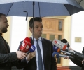 Deputeti Agron Shehaj duke folur per gazetaret jashte ambienteve te parlamentit. Shehaj u perjashtua nga seanca pasi debatoi me zv/kryeministen dhe ministren e energjise dhe infrastruktures, Belinda Balluku.