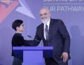 Kryeministri Edi Rama dhe Komisionerja Evropian per Fqinjesine dhe Zgjerimin, Marta Kos duke folur gjate nje konference te perbashket pas samitit rajonal Rruga jone drejt BE. Ne samit kane marre pjese perfaqesuesit e shteteve te Ballkanit Perendimor, per te diskutuar planin e rritjes se BE per kete rajon dhe rrugetimin e shteteve drejt BE.