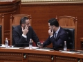 Ministri i Financave, Petrit Malaj dhe ministri i brendshem, Besfort Lamllari duke folur gjate nje seance parlamentare. Gjate saj jane disktuar problematikat e zgjedhesve.
