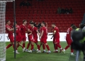 Lojtaret e Partizani festojne shenimin e nje goli gjate ndeshjes se futbollit derbi Partizani - Tirana, 2-0, e vlefshme per Kategorine Superiore, e luajtur ne stadiumin Air Albania ne Tirane.