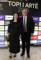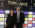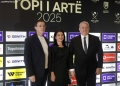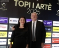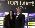 The President of the Albanian Football Federation, Armand Duka, and his wife outside the Opera and Ballet Theater for the 2025 Golden Ball ceremony, where the best footballers of the year will be honored.