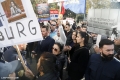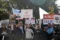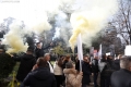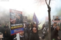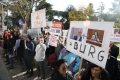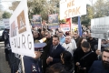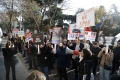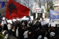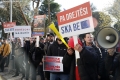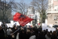 Members and supporters of the Mundesia party with banners in their hands during a protest in front of the parliament headquarters. The protesters have demanded the lifting of the immunity of Deputy Prime Minister Belinda Balluku