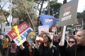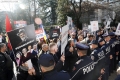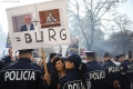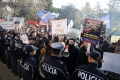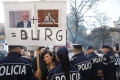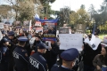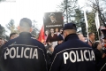Police force Members and supporters of the Mundesia party with banners in their hands during a protest in front of the parliament headquarters. The protesters have demanded the lifting of the immunity of Deputy Prime Minister Belinda Balluku