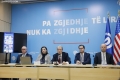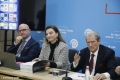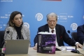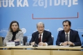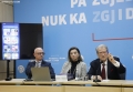 KONFERENCE E PD PAS PROTESTES - Kryetari i PD, Sali Berisha dhe deputetet Albana Vokshi e Oerd Bylykbashi gjate nje konference per shtyp ne ambientet e selise se PD. Gjate konference eshte prezantuar nje botim i dyte permbledhes me akuzat e PD per vjedhjen e zgjedhjeve 2025
