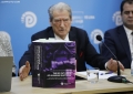 Kryetari i PD, Sali Berisha duke folur gjate nje konference per shtyp ne ambientet e selise se PD. Gjate konference eshte prezantuar nje botim i dyte permbledhes me akuzat e PD per vjedhjen e zgjedhjeve 2025