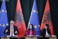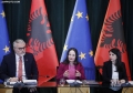 Ministrja e shtetit dhe Kryenegocitarja e Shqiperise per hyrjen ne BE, Majlinda Dhuka, Ministri i shtetit per marredheniet me parlamentin, Toni Gogu dhe Ministrja e Shtetit per antikorrupsionin, Adea Pirdeni gjate nje konference per shtyp, ku eshte prezantuar paketa ligjore ne kuader te negociatave per hyrjen ne BE.
