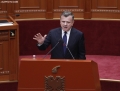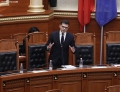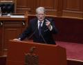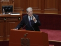 Kryetari i PD, Sali Berisha duke folur ne nje moment tensioni gjate nje seance parlamentare. Gjate seances, ka pasur debate dhe tension midis perfaqesuesve te mazhorances dhe opozites.