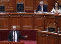 Deputeti Gazment Bardhi duke folur ne nje moment tensioni gjate nje seance parlamentare. Gjate seances, ka pasur debate dhe tension midis perfaqesuesve te mazhorances dhe opozites.