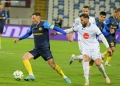 FUTBOLL FC DRITA KUNDER NK CELJE - Zan-Luk Leban i NK Celje gjate nje dyluftimi me Besnik Krasniqi te FC Drita gjate ndeshjes se pare te futbollit per fazen eliminatore te UEFA Conference League 2025/26, midis FC Drites dhe NK Celje ne stadiumin Fadil Vokrri me 19 shkurt 2026, ne Prishtine, Kosove.